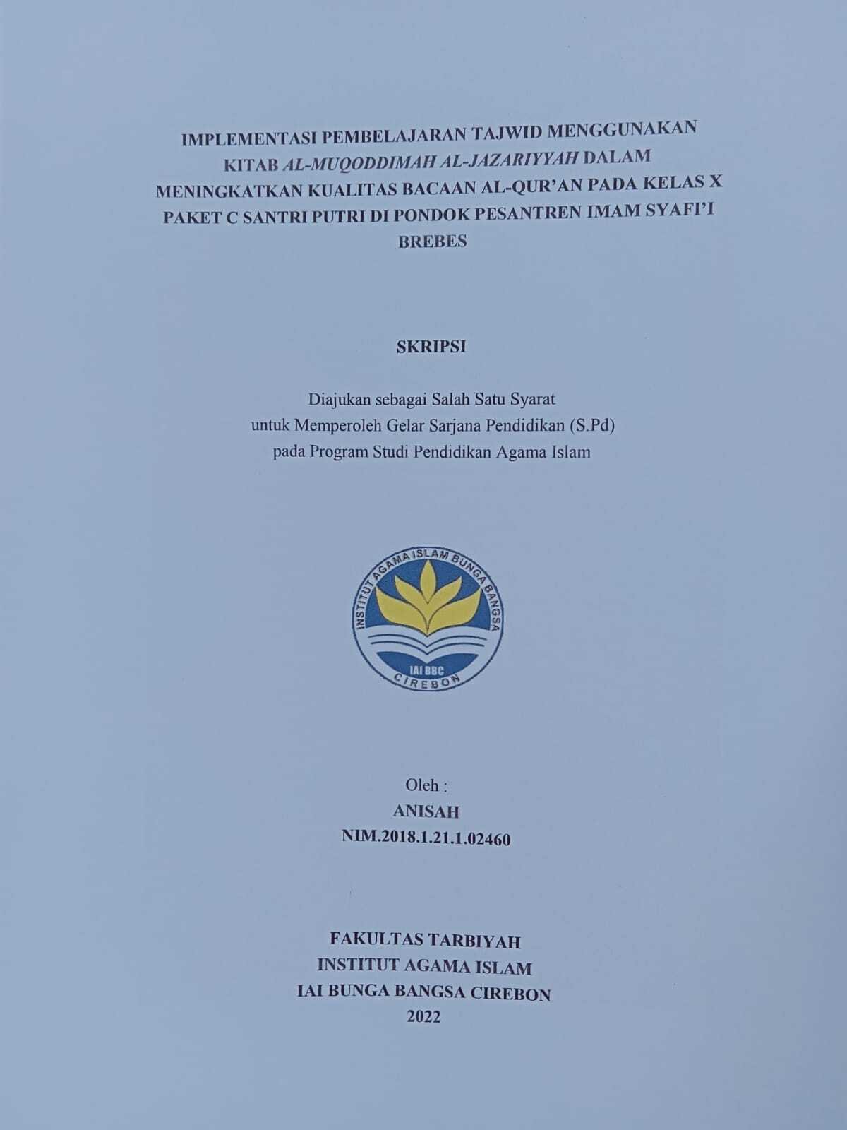 | Judul: | IMPLEMENTASI PEMBELAJARAN TAJWID MENGGUNAKAN KITAB AL-MUQODDIMAH AL-JAZARIYYAH DALAM MENINGKATKAN KUALITAS BACAAN AL-QUR’AN PADA KELAS X PAKET C SANTRI PUTRI DI PONDOK PESANTREN IMAM SYAFI’I BREBES |
