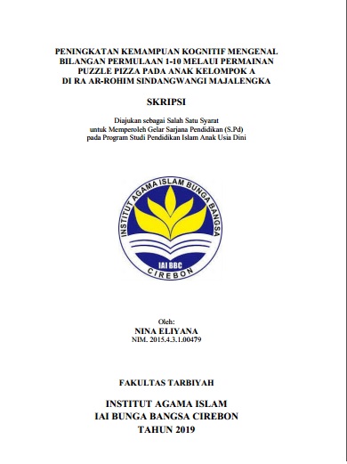 NINA ELIYANA. NIM. 2015.4.3.1.00479 PENINGKATAN KEMAMPUAN KOGNITIF MENGENAL BILANGAN PERMULAAN 1-10 MELAUI PERMAINAN PUZZLE PIZZA PADA ANAK KELOMPOK A DI RA ARROHIM SINDANGWANGI MAJALENGKA Penelitian ini dilatarbelakangi oleh kemampuan mengenal lambang bilangan 1-10 pada Raudlatul Athfal Ar-Rohim rendah. Hal ini terbukti dengan hasil belajar siswa yang menunjukan 78,26% anak belum mengenal lambang bilangan 1-10 pada rentang usia 4-5 tahun. Penelitian ini bertujuan untuk mengetahui proses pembelajaran mengenal lambang bilangan 1-10 pada Kelompok A Di Raudlatul Athfal Ar-Rohim, Sindangwangi, Majalengka dengan menggunakan media Puzzle pizza angka. Serta untuk mengetahui peningkatan kemampuan mengenal lambang bilangan 1-10 pada Kelompok A Di Raudlatul Athfal Ar-Rohim, Sindangwangi, Majalengka melalui penggunaan media Puzzle pizza angka. Metode yang digunakan dalam penelitian ini adalah penelitian tindakan kelas dengan model Kurt Lewin. Penelitian ini dari Pra Siklus, Siklus I, Siklus II, dan Siklus III. Pada Siklus I, Siklus II, dan Siklus III terdiri dari empat tahap yaitu perencanaan, tindakan, observasi, dan refleksi. Subjek penelitian ini adalah siswa Raudlatul Athfal Kelompok A1 Usia 4-5 tahun dengan jumlah 23 anak. Hasil Penelitian adalah sebagai berikut: 1) Pembelajaran dengan menggunakan media Puzzle pizza angka dapat berjalan dengan baik dalam setiap siklus. Hal ini dapat dilihat dari hasil observasi aktivitas guru dan siswa. Hasil aktivitas guru pada siklus I mencapai 78,6%, (cukup) siklus II 83,4% (cukup), dan siklus III 92,8% (baik). Sedangkan hasil observasi aktivitas siswa pada siklus I mencapai 76,2% (cukup), siklus II 83,4% (cukup), dan siklus III 94,04% (sangat baik). 2) Adanya peningkatan kmampuan mengenal lambang bilangan 1-10 setelah adanya pengunaan media Puzzle pizza angka. Hal ini dapat terlihat dari hasil ketuntasan belajar anak pada tahap siklus I 39,2% (Belum Berkembang) dengan rata-rata 50,35 (cukup), siklus II hasil ketuntasan belajar anak 60,9% (Mulai Berkembang) dengan rata-rata 68,09 (cukup), dan siklus III hasil ketuntasan belajar anak 91,4% (Berkembang Sangat Baik) dengan rata-rata 82,9 (baik). Kesimpulanya bahwa penggunaan media Puzzle pizza angka dapat meningkatkan kemampuan anak dalam mengenal bilangan 1-10 |