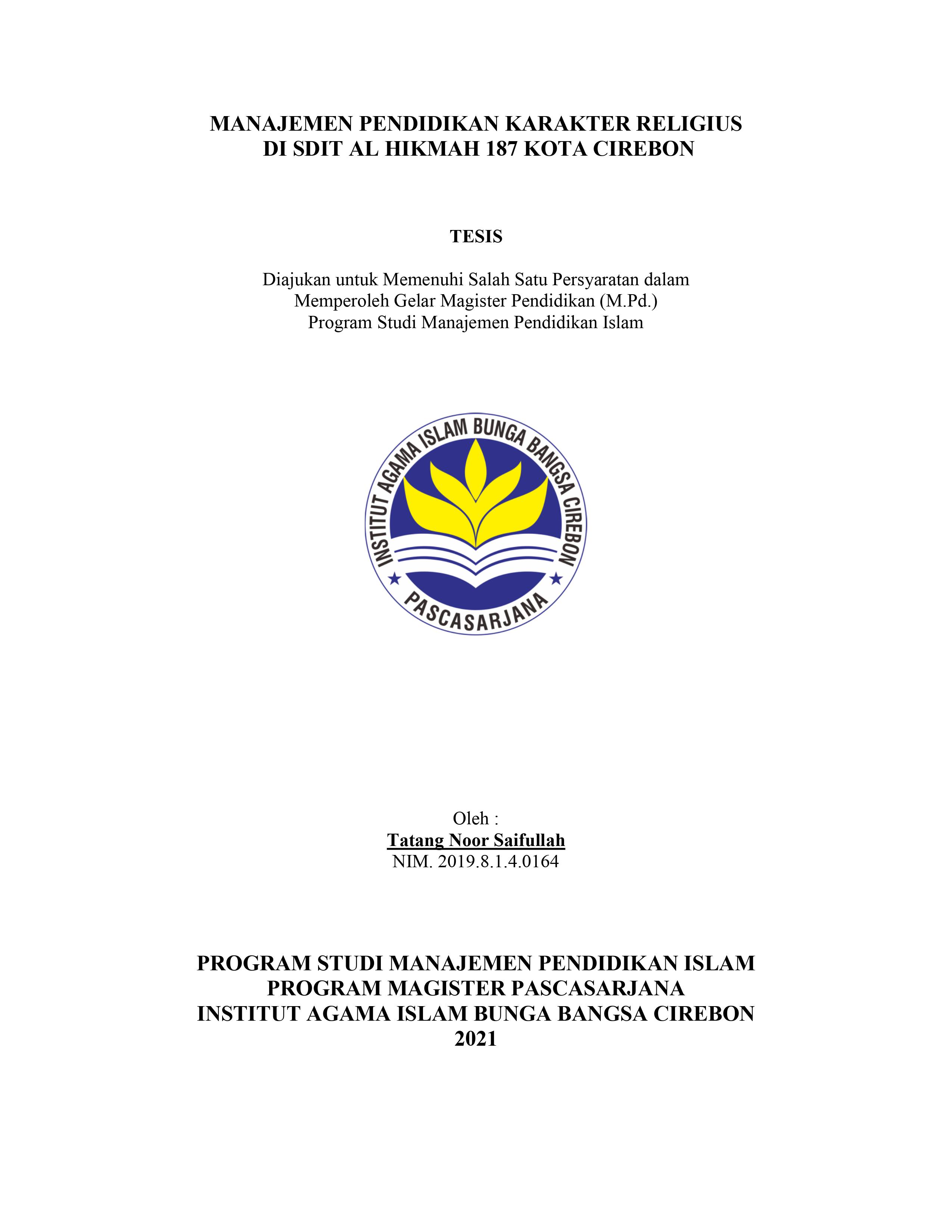 | Judul: | MANAJEMEN PENDIDIKAN KARAKTER RELIGIUS DI SDIT AL HIKMAH 187 KOTA CIREBON |